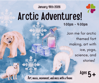 Bundle up for an afternoon of imagination, movement, and hands-on discovery as we journey into the icy world of the Arctic! In Arctic Adventures, children will explore how people and animals survive in cold climates through playful challenges, creative art, and cooperative play.