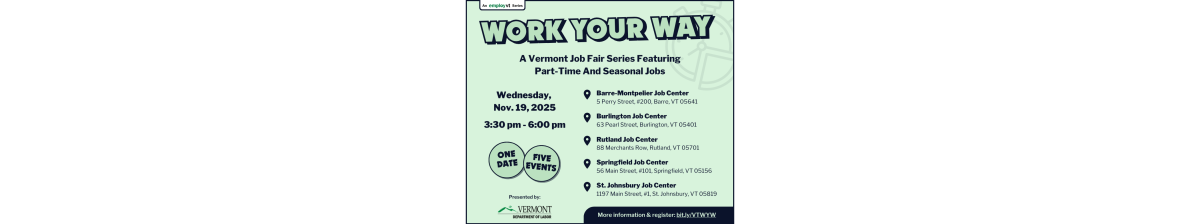 Join us across the state for the Work Your Way Part-Time & Seasonal Job Fair Series! From 3:30 pm to 6:00 pm, you can meet employers who are hiring for jobs that fit every age and stage of life. What are you waiting for? Polish your resume and come out! This event is completely free. Sponsored by the Vermont Department of Labor. If you have questions, call your local American Job Center.